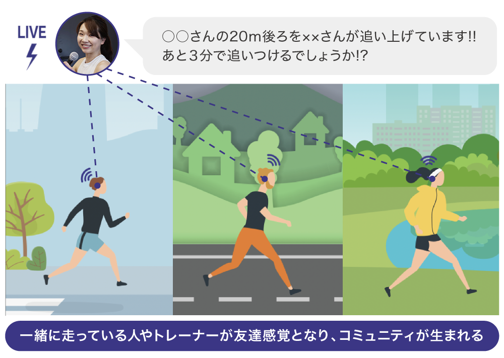 3つ目は、専門性の高いコーチ陣が集結したことで生まれるコンテンツ力です。マラソンをはじめ様々なスポーツのアスリートや、専門家らがコーチとして参加しています。それぞれのコーチが得意分野の話をしながら実況し、ユーザーを鼓舞します。