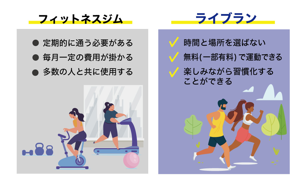 「ライブラン」では、この2つの要素に加え、ジムの会費よりも安い会費と、特定の場所を選ばなくても参加できるフルリモートの体系を採用しています。まさに運動に不慣れな方でも、気軽に楽しく継続できる仕組みを意識しています。
