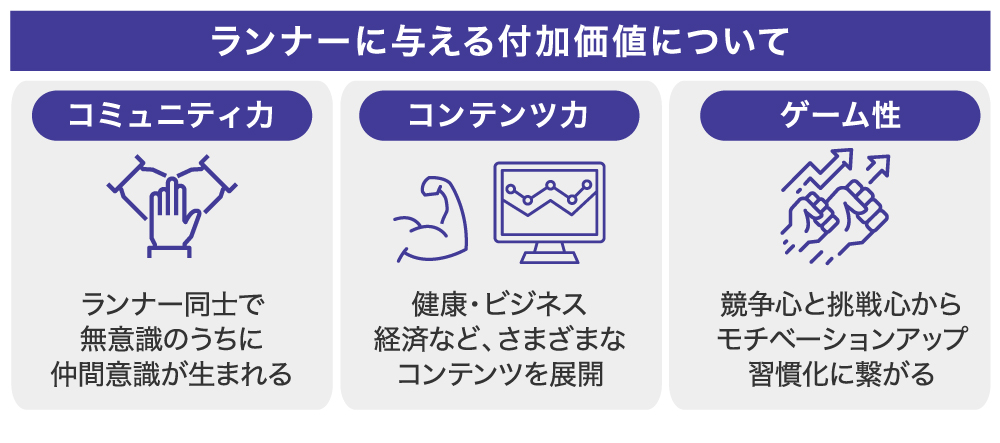 1つ目は、コミュニティを活性化させる仕組みです。一人では継続しにくいランニングでも、複数人がオンライン上で集合すれば一緒に走る仲間が増え、モチベーションを上げるきっかけになります。