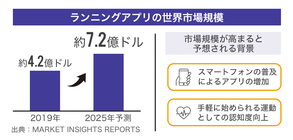 また、ランニングアプリの世界市場規模は、スマートフォンの普及や、通信環境の向上などの影響もあることから、2025年で7.2億ドルを超える見通しで成長が期待されていることから、今後もユーザーの増加を見込んでいます。
