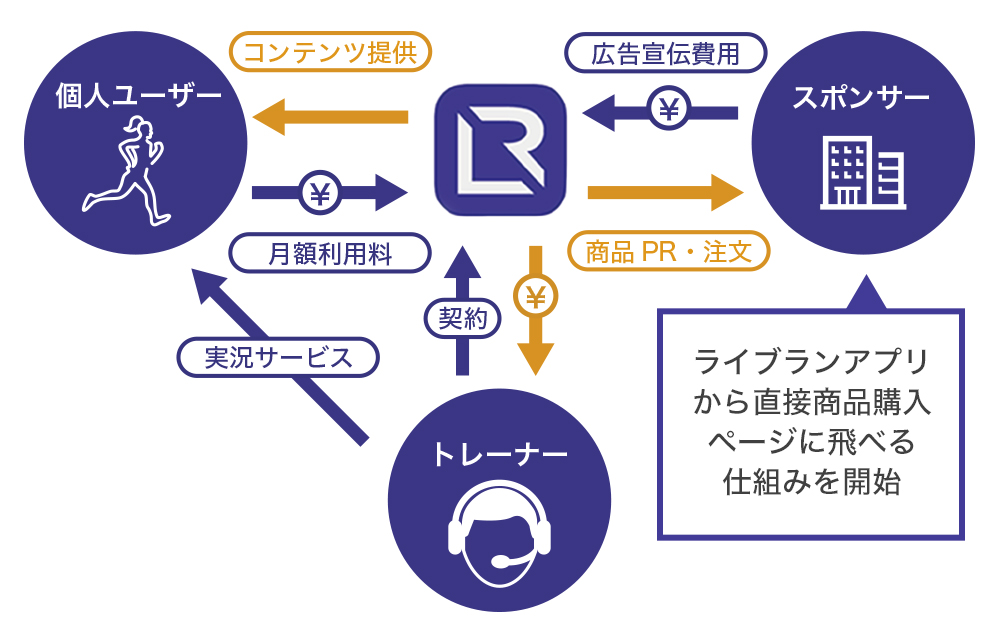 そこで、色々と調査をした結果、「ライブラン」はそのサービスの特性上、フィットネスや健康関連の企業とも相性が良いことに気づき、今は新たなスポンサーを獲得し、広告費をもらうビジネスにも注力しています。