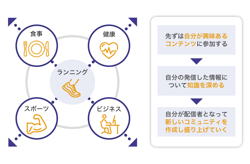 また、コミュニティを細分化すると同時にコミュニティリーダーの輩出も目指します。コミュニティリーダーとは、ユーザーの中でもとくに運動や健康への意識が高く、かつ自ら発信することに積極的な方々で、その方々に「ライブラン」内で配信者となってもらうことを試みます。