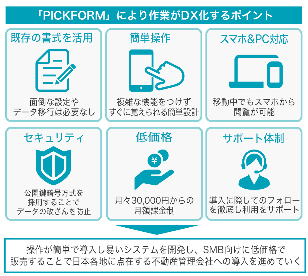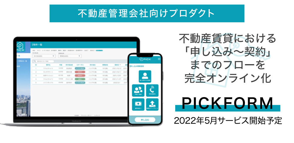 åŒç€Ÿã¯ãåè¿°ãã課é¡ã解決ãããããäžåç£è³è²žã«ãããç³èŸŒå¥çŽããã³å¥ç޿޿°æ¥åããªã³ã©ã€ã³ã§å®çµããããå°èŠæš¡ãªäžåç£ç®¡çäŒç€ŸåããµãŒãã¹ãPICKFORMããéçºããŸããã