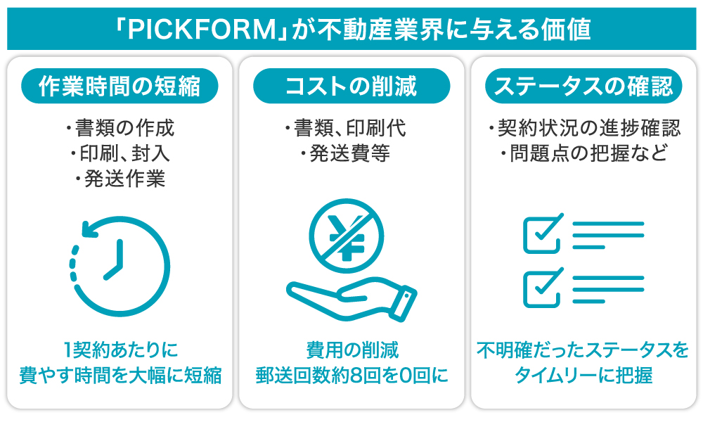 åŒç€Ÿã¯ãäžåç£ç®¡çäŒç€Ÿåãã«ç¹åããé»åæŒå°ã·ã¹ãã ãéçºããããšã§ããPICKFORMãã®åªäœæ§ãå®çŸããŠããŸããäŸãã°ãäžè¬çãªé»åæŒå°ã·ã¹ãã ã®å Žåãäžåç£è³è²žå¥çŽã®é»åååŒã§ã«ããŒã§ããæ©èœã¯ããè³è²žåå¥çŽæžããéèŠäºé èª¬ææžããéµã®å枡蚌ããªã©éèŠãªå¥çŽã«éãããå Žåãæ®ã©ã§ãã
