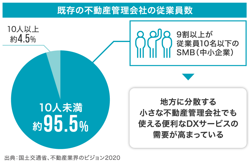不動産業界における不動産管理会社や仲介業者のうち約95.5%を占めるのは従業員10人未満のSMBであり、その累計事業者数は年々増加傾向にあります(出典:国土交通省、不動産業界のビジョン2020)。