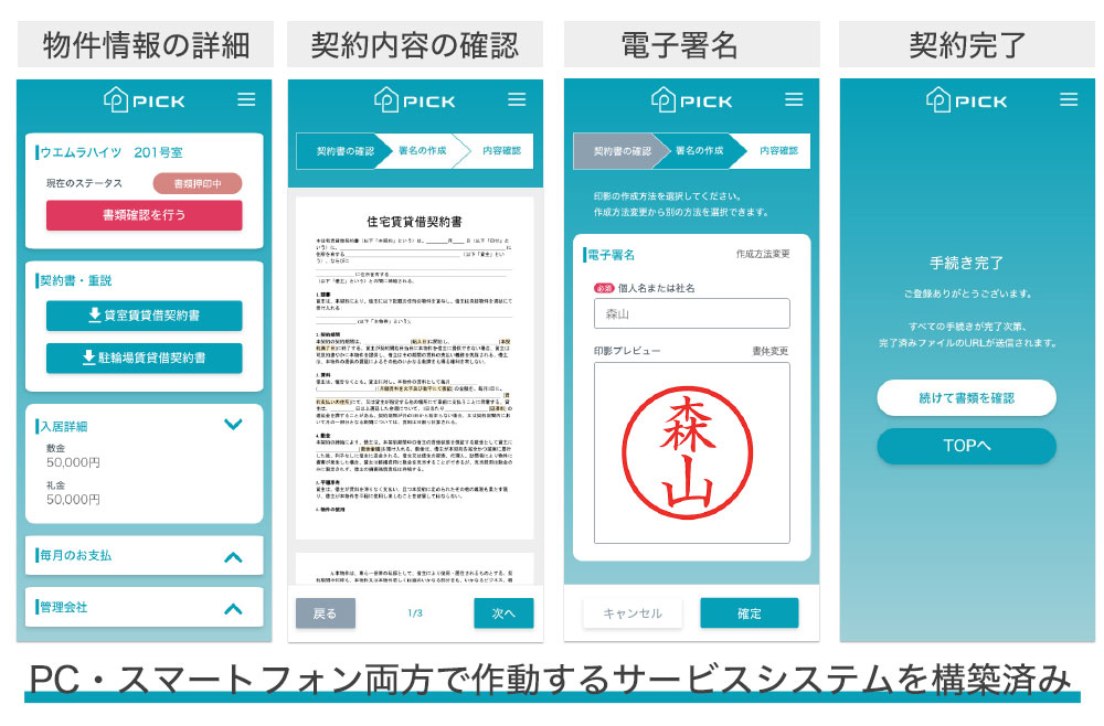 ããã«åãããŠããPICKFORMãã¯ã5æ18æ¥ãããµãŒãã¹ã®æäŸéå§ãäºå®ããŠããŸãããµãŒãã¹å ã§å®å šæ§ã®é«ãé»åæŒå°ã·ã¹ãã ãèªç€Ÿéçºããããšã§ãç³èŸŒããå¥çŽæç¶ããŸã§ãé»åå¥çŽã§å®çµã§ããããã«ããŸããããã«ãããã¢ããã°ã§è¡ãããå¥çŽäœæ¥ãå¹çåãããæ°ããä»çµã¿ã確ç«ããããšèããŠããŸãã