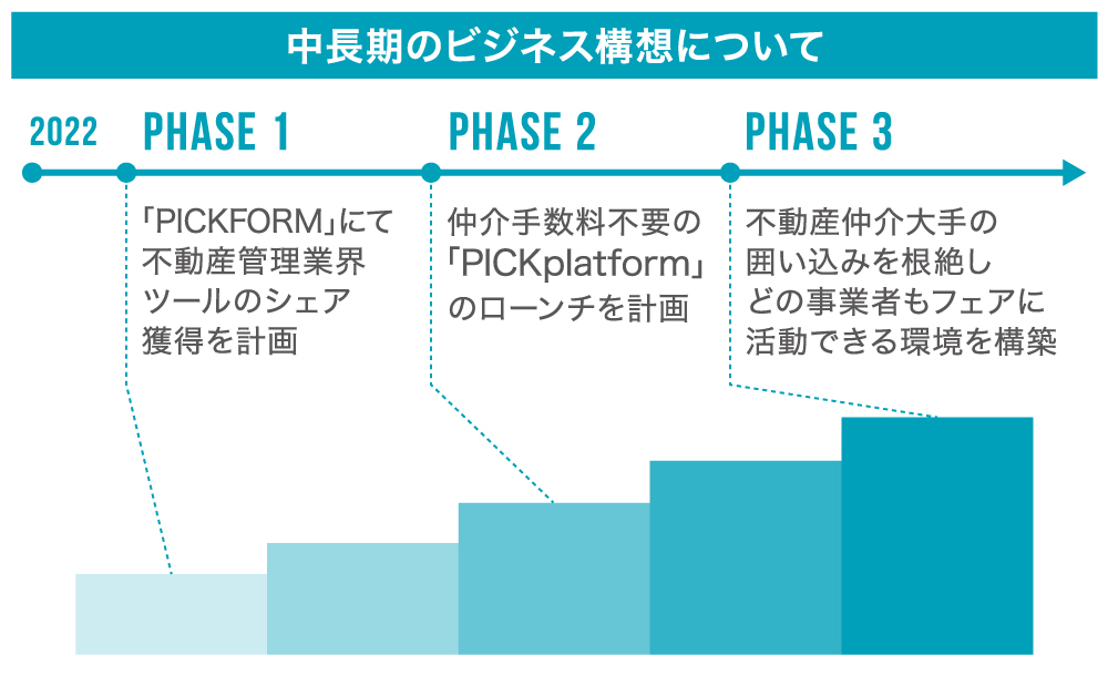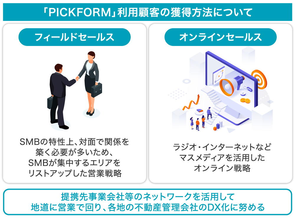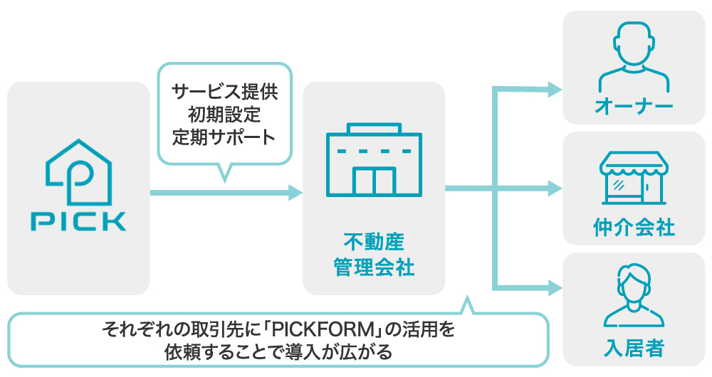 ããã«ãSMBåãSaaSãšããååç¹æ§ãšãïŒå¥çŽã®äžã§å ¥å± è ã»äžåç£ä»²ä»äŒç€Ÿã»ç®¡çäŒç€Ÿã»ãªãŒããŒãšè€æ°ã®é¢ä¿è ãšã®ããåããçºçããæ¥çæ§é ãå©çšããããªãŒãã©ã€ã¢ã«ãªã©ãéãã販路æ¡å€§æŠç¥ãå±éããŸãããPICKFORMããéããŠãäžåç£æ¥çã®ãç¡é§ããçãããªãŒãã³ãªäžåç£ååŒãå®çŸããã®ãåŒç€Ÿã®ç®æãããžã§ã³ã§ãã