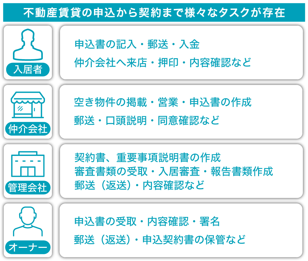 äŸãã°ãäžåç£è³è²žã®ç³èŸŒããå¥çŽãããŒãŸã§ã®æµãã«ãããŠãå ¥å± è ã»äžåç£ä»²ä»äŒç€Ÿã»ç®¡çäŒç€Ÿã»ãªãŒããŒãªã©å€ãã®é¢ä¿è ãä»åšããŠããããæ¥åãããŒãè€éã§ããããã«ãçŽããŒã¹ã®å¥çŽæžèšå ¥ã»æŒå°ã»å¯Ÿé¢ã«ããéèŠäºé 説æçãå¿ èŠãªãããé¢ä¿è éã§éµéã«ããããåããå€ããïŒä»¶ã®ç³èŸŒå¥çŽãæç«ãããŸã§ã«å€å€§ãªæéãšã³ã¹ããããã£ãŠããŸãã