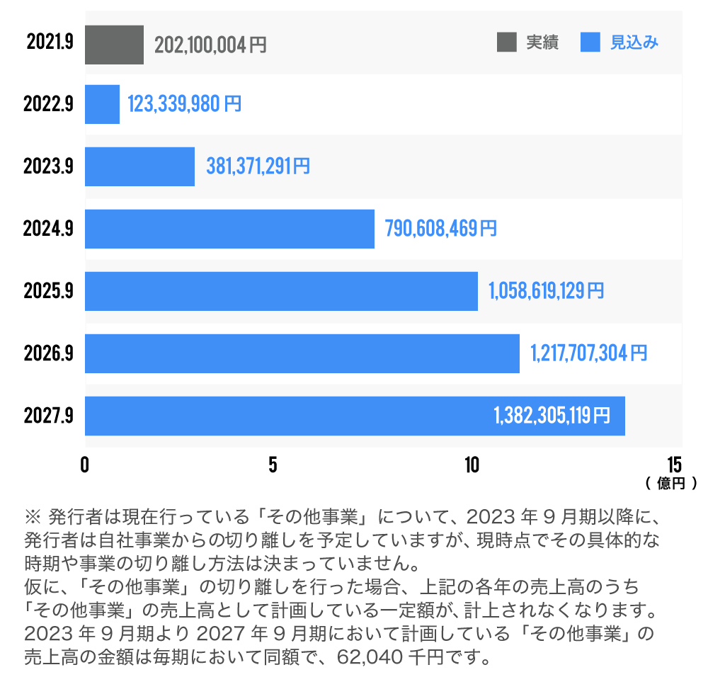 äžã®è¡šã¯çŸæç¹ã«ãããŠä»åŸã®çµå¶ãäºæ¥èšç»éãã«é²å±ããå Žåã®ã¹ã±ãžã¥ãŒã«ã§ãããã®ãããä»åã®è³é調éã®æåŠã調ééé¡ã«ãã£ãŠãã¹ã±ãžã¥ãŒã«ã¯å€æŽãšãªãå ŽåãããããŸãã®ã§ãäºããäºæ¿ãã ããããŸãã売äžé«ã¯äºæ¥èšç»ãåæãšããŠãããçºè¡è ã®äºæ³ã§ãããããå°æ¥ã®æ ªäŸ¡åã³IPOçãä¿èšŒãããã®ã§ã¯ãããŸããã