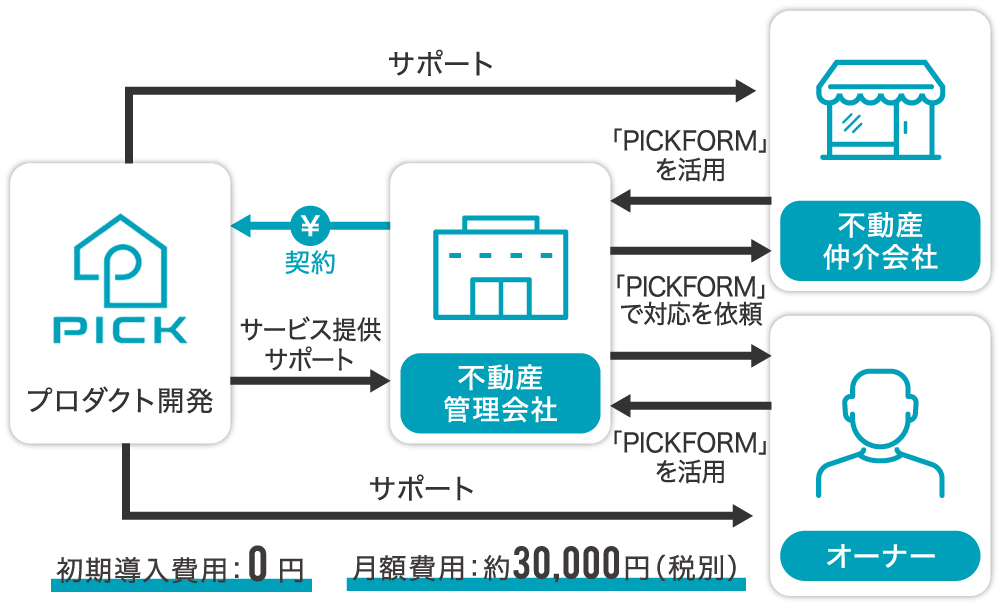 不動産取引は、オーナー・仲介会社・管理会社・貸借人など複数の関係者間で、会社の垣根をこえてやり取りが発生します。そのため1社の不動産管理会社が「PICKFORM」を利用することで、他の関係者にも自然と利用機会を提供することができます。