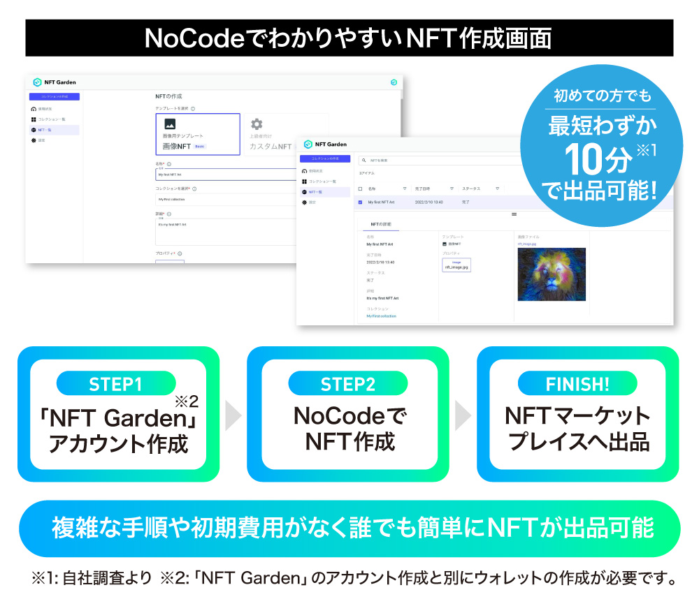 ãNFT Gardenãã§ã¯ãNFTã®äœæãç¡æã§å§ããããNoCodeïŒããŒã³ãŒãïŒãœãŒã¹ã³ãŒããæžãããšãªãã¢ããªã±ãŒã·ã§ã³ããœãããŠã§ã¢ãäœæããããšïŒã§NFTãäœæã§ããŸãããããŠãNFTããŒã±ãããã¬ã€ã¹ãžã®åºåãŸã§ãç°¡åãªã¹ãããã§å®æœã§ããããã«ããŠããŸãã