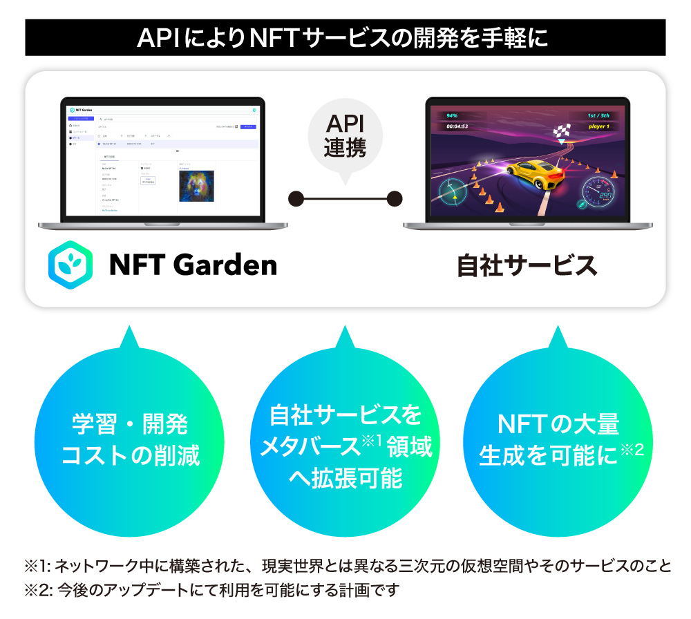 ãããããNFT Gardenãã®APIïŒApplication Programming InterfaceïŒãœããå士ãäºãã«æ å ±ããããšãããã®ã«äœ¿çšããä»çµã¿ïŒã䜿ãããšã§ããããã®åŠç¿ã³ã¹ããªãèªç€ŸãµãŒãã¹ãžNFTã®ä»çµã¿ãå°å ¥ããããšãã§ããŸãããŸããå°æ¥çã«ã¯ãNFTãAPIçµç±ã§å€§éã«çæã§ããããã«ãªãäºå®ã§ãã