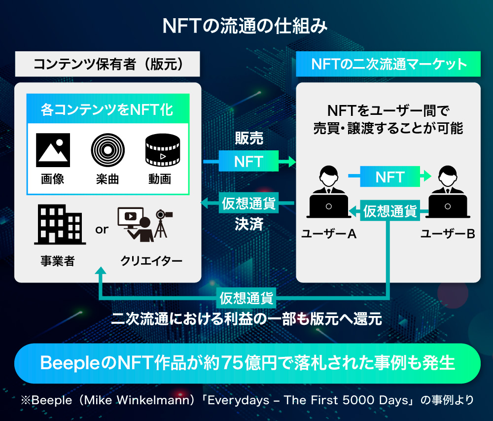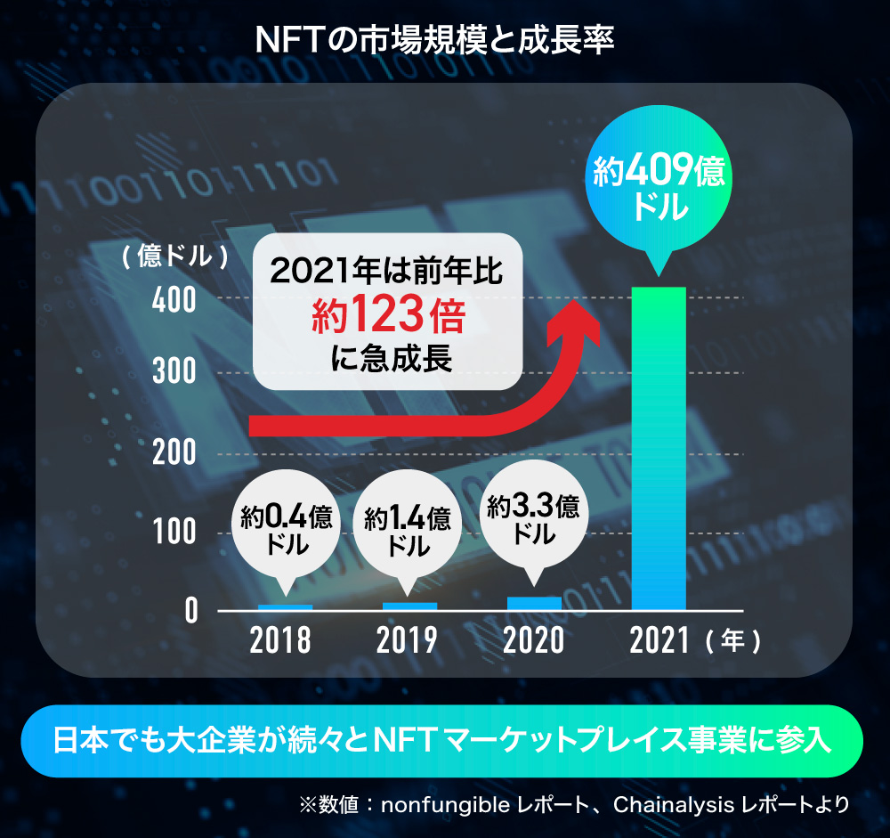 ããããé«é¡ã®ååŒäŸãèå人ã®åå ¥ãçžæ¬¡ããäžã«åºãå ±ããããããšããã£ãŠãNFTã¯æšå¹Žé ããäžççã«çãäžãããèŠããããã«ãªã£ãŠããŸããæ¥æ¬ã§ãæ§ã ãªããŒã±ãããã¬ã€ã¹ïŒååŒåžå ŽïŒãçãŸããŠãããã¯ãªãšã€ã¿ãŒãäŒæ¥ã®éçºè ãªã©ã®ã¢ãŒãªãŒã¢ããã¿ãŒïŒæ°ããååããµãŒãã¹ãªã©ãæ©æã«åãå ¥ããæ¶è²»è ã«å€§ããªåœ±é¿ãäžããå±€ïŒãNFTã«è§Šããããã«ãªã£ãŠããŸãã