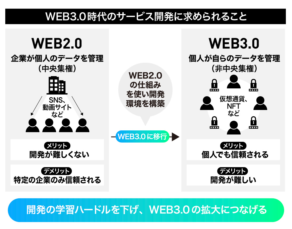 ããããæè¡ã®ç§»è¡ã¯ãç·ããŠéçºè ãã¡ã®åŠç¿ã«æéãèŠããããããŒãã«ãé«ãã®ã§ãããããåŒç€Ÿã¯ãéçºè ãã¯ãªãšã€ã¿ãŒãWEB2.0 ã®æè¡ã䜿ã£ãŠWEB3.0ã®è£œåãäœããä»çµã¿ãæ§ç¯ããŠãããããšèããŠããŸããããã«ãããéçºè ãã¯ãªãšã€ã¿ãŒã®åŠç¿ããŒãã«ãäžããWEB3.0ã®äžçèŠ³ã®æ¡å€§ã«ç¹ããŠãããããšèããŠããŸãã