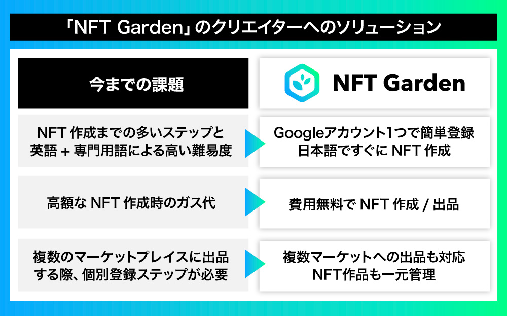 åŒç€Ÿã¯ãNFTåžå Žã®æŽ»æ§åã«åããããç°¡åã«ãããæè»œã«NFTãäœæãããŒã±ãããã¬ã€ã¹ã«åºåã§ãããNFT GardenãããªãªãŒã¹ããããŸããããNFT Gardenãã¯ãNFTäœæãã©ãããã©ãŒã ã§ãåŒç€Ÿã¯ã¯ãªãšã€ã¿ãŒããã³ãäŒæ¥ã®éçºè åãã«ãµãŒãã¹ãæäŸããŸãã