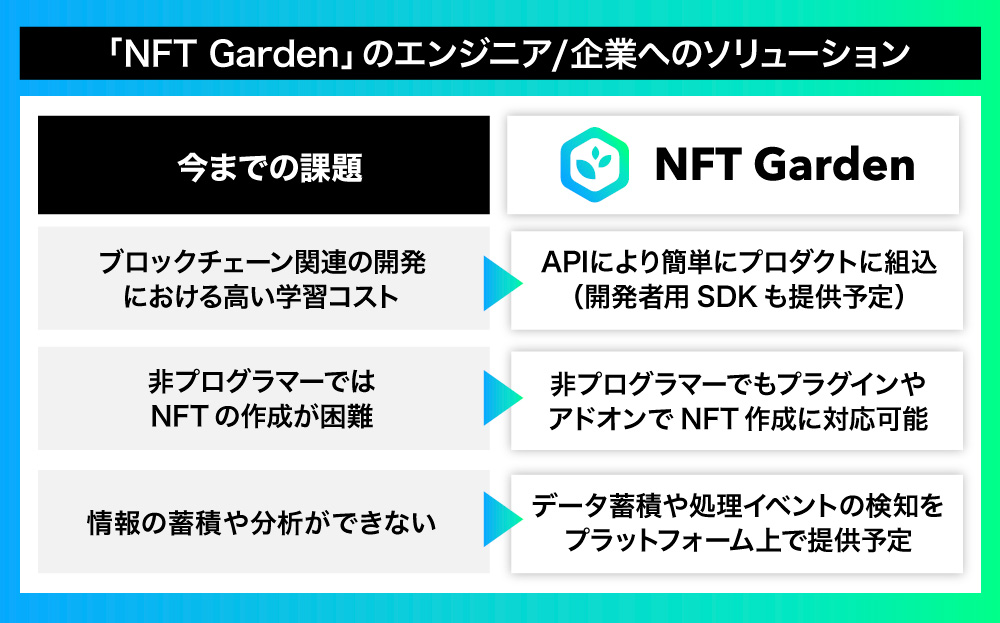ãããŠãNFTã®äžççãªæ¡å€§ãåããŠãæ ç»ãã²ãŒã æ¥çãªã©ã¯ãã£ã³ããŒã³ã«NFTãé åžããæ©äŒãå¢ããããã«ãã10,000ã100,000åäœã§ã®NFTã®å€§éäœæãå¿ èŠãšãªã£ãŠããŸããä»åŸã¯ããNFT Gardenãã®APIã䜿ãããšã§ãäŒæ¥ã¯èªç€Ÿã®ããã°ã©ã ããµãŒãã¹ãšé£æºããèªåšãã€è¿ éã«NFTãäœæã§ããããã«å®è£ ããäºå®ã§ãã
