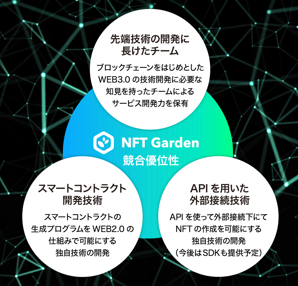 ãNFT Gardenãèªäœã®WEB3.0çã®æäŸããNFTãšç©çäžçãã€ãªãæ°ããä»çµã¿ã®æ§ç¯ãDAOïŒDecentralized Autonomous OrganizationïŒåæ£åèªåŸçµç¹ïŒããŒã¯ã³ã®çºè¡ãªã©æ°ããäºæ¥é åã«ãããŠWEB3.0åã®éçºããªãŒãããäŒæ¥ãç®æããŸãã