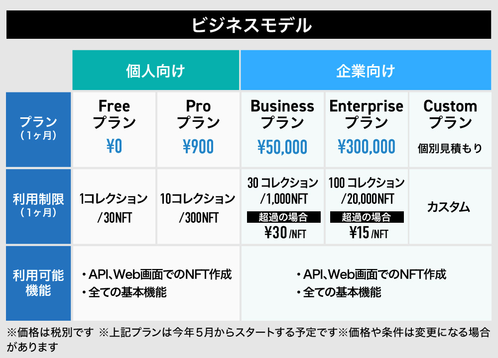 ã¯ãªãšã€ã¿ãŒã«é¢ããŠã¯ãæ30åã®NFTãäœãããã©ã³ããç¡æãã©ã³ããšããŠæäŸãã31å以äžã®äœæã§ã¯ãããªã¥ãŒã ã«å¿ãããµãã¹ã¯ãªãã·ã§ã³ãæäŸããããšãèšç»ããŠããŸãã