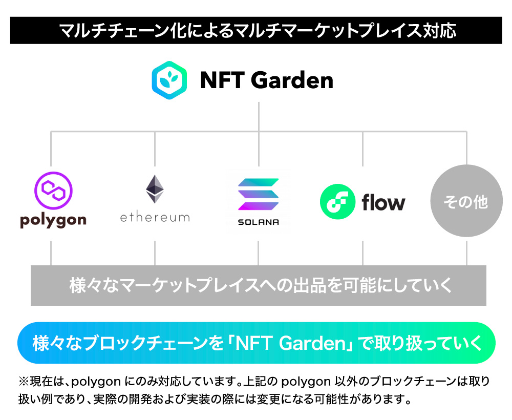 ãNFT Gardenãã¯ãçŸåšãã€ãŒãµãªã¢ã ïŒethereumïŒã®ã»ã«ã³ãã¬ã€ã€ãŒãœãªã¥ãŒã·ã§ã³ã§ãããããªãŽã³ïŒpolygonïŒããšãããããã¯ãã§ãŒã³ãæ¡çšããŠããŸãããä»åŸãç°ãªããããã¯ãã§ãŒã³ãæ¡çšããŠããè€æ°ã®ããŒã±ãããã¬ã€ã¹ã«åºåã§ããããããã«ããã§ãŒã³åãé²ããŠãããŸããããã«ããããNFT Gardenãã®ãŠãŒã¶ãŒããOpenSeaã以å€ã®ããŒã±ãããã¬ã€ã¹ã暪æããŠéçšã§ããç¶æ³ãåµåºããNFTå£²è²·ã®æç«ãåŸæŒãããŠãããŸãã