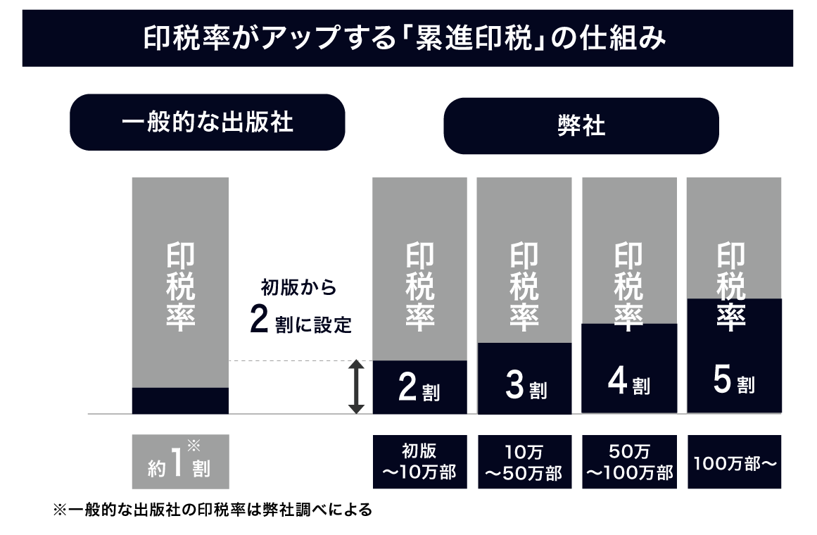 弊社は、これまで出版業界の慣習によって約1割(弊社調べによる)と決められていることが多い印税率を、はじめから2割に設定することで、作家がこれまで以上に収入を得られる世界を目指しています。さらに「累進印税」と名づけた、売上部数に応じて最大5割まで印税率がアップする仕組み、「ダイナミックプライシング」も導入します。