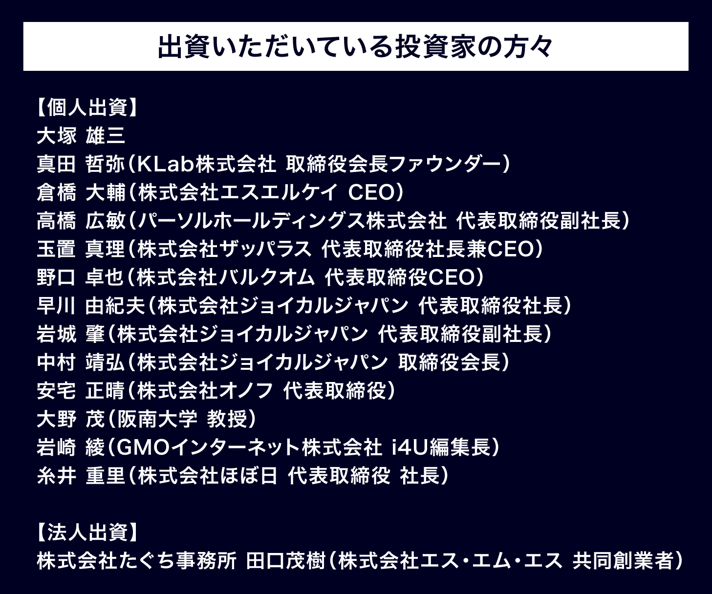 弊社は、エンジェル投資家及び法人より出資を受けています(敬称略)。