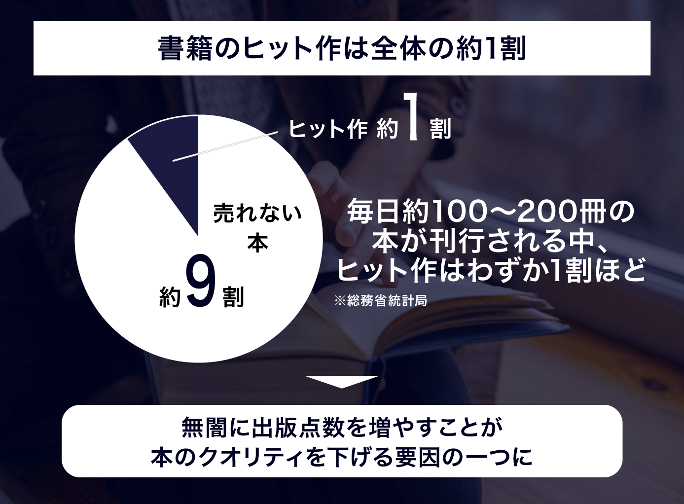 すべての出版社を合計すると、なんと現在、1年365日、毎日約100~200冊が刊行されています(出典:総務省統計局)。出版点数を無闇に増やし、その中の1〜2割がヒット作となって大きな利益が出る。ヒット作から生まれた利益を、次のヒット作を生むために、また大量の新作へと投下していく。現行の出版社が行うビジネスモデルは、数を打てば当たる戦法なのです。