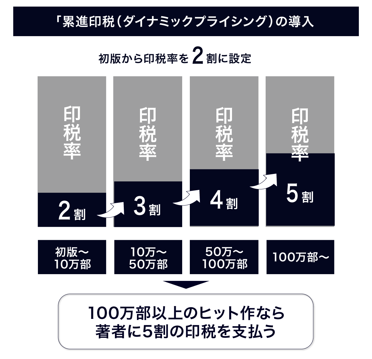 弊社はこのような課題を、最大5割の印税率が適用される「累進印税(ダイナミックプライシング)」を導入することで解決したいと考えています。