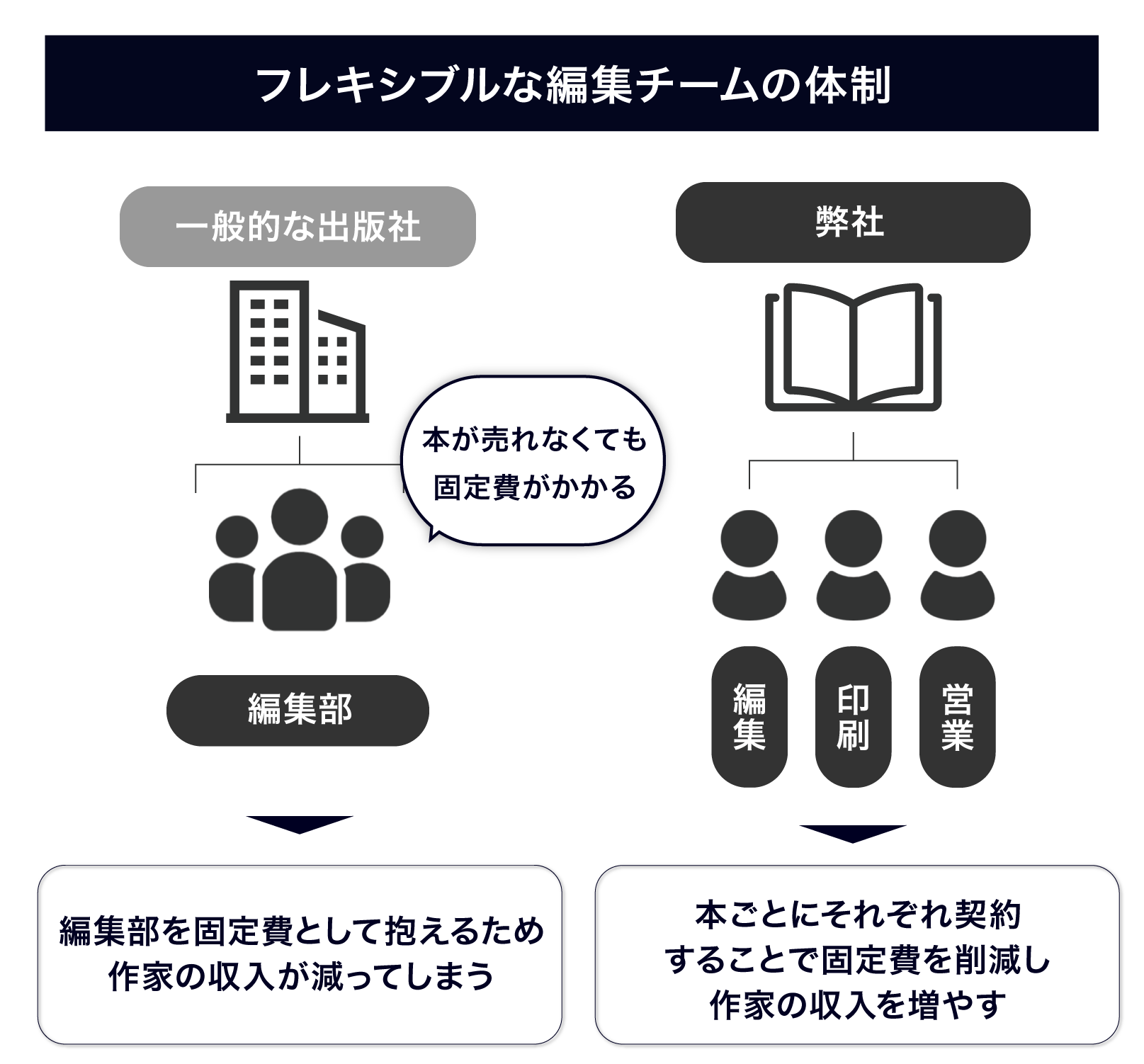 弊社では固定の編集部を持つのではなく、書籍1点ごとに編集者、印刷、営業(流通)の業務委託チームをつくるフレキシブルな体制を組みます。これにより、固定コストを抑えます。
