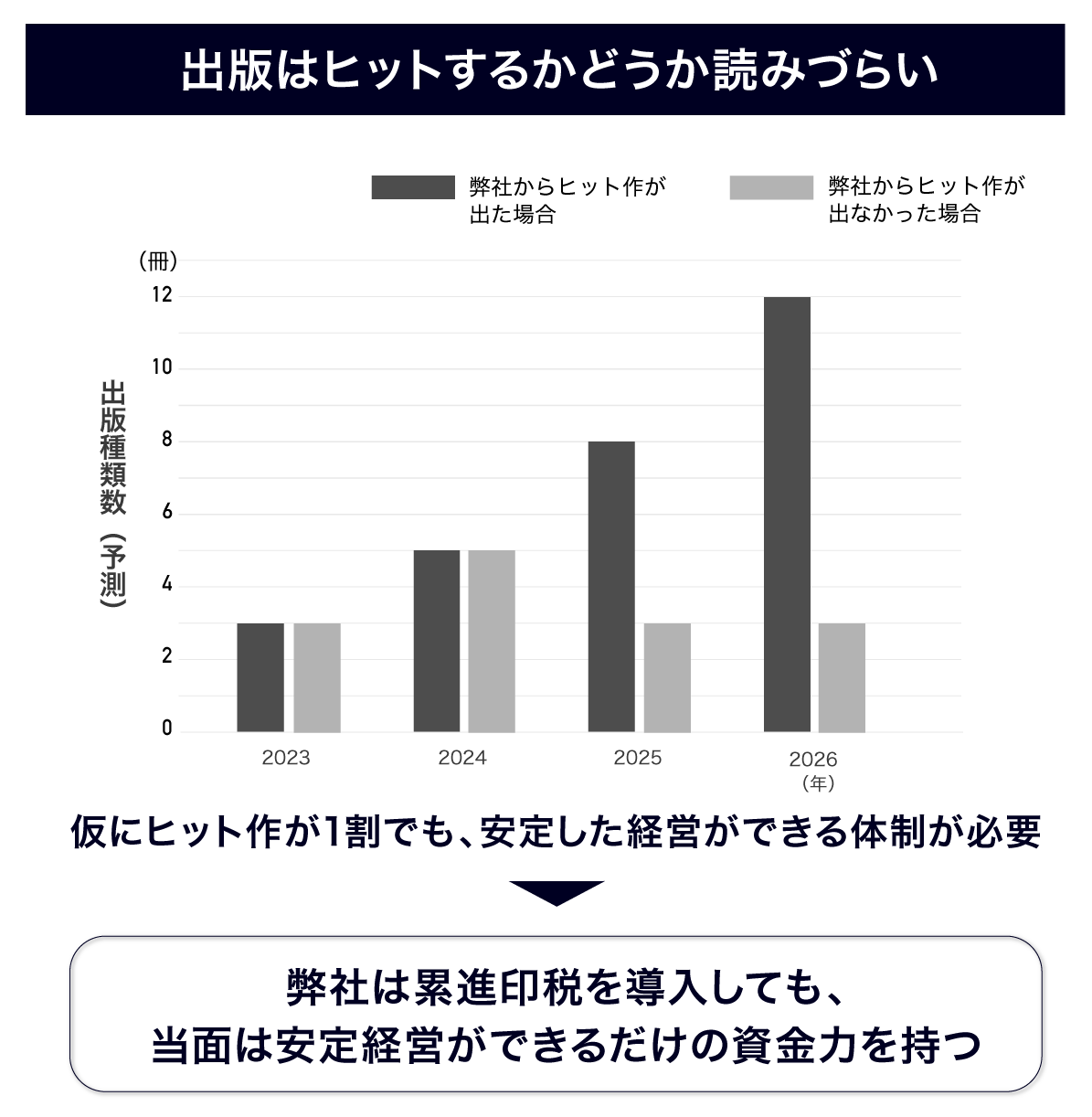 統計的に言えば、弊社の出版する本も約1~2割しかヒットが出ないことになりますが、弊社は累進印税を導入しても当面は安定した経営ができると考えています。