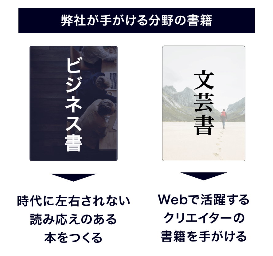 弊社は、ビジネス書と文芸書の分野で本をつくります。