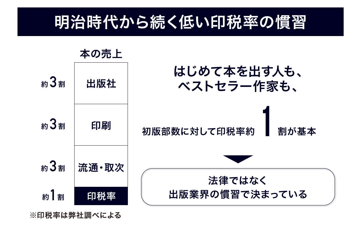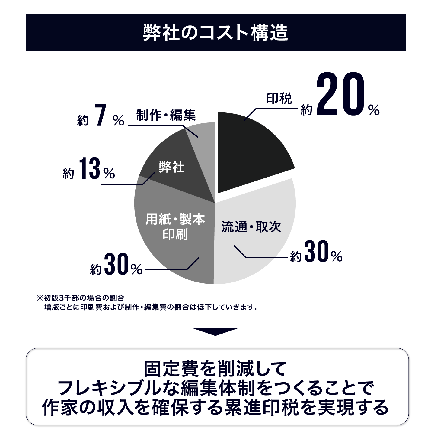 実は、この印税率は法律で定められているわけではなく、出版業界の慣習で決まっているものです。これからの出版文化を盛り上げていくためにも、今、弊社のような新しい出版社が身銭を切ってでも書籍出版の構造を変えていく必要があると考えています。