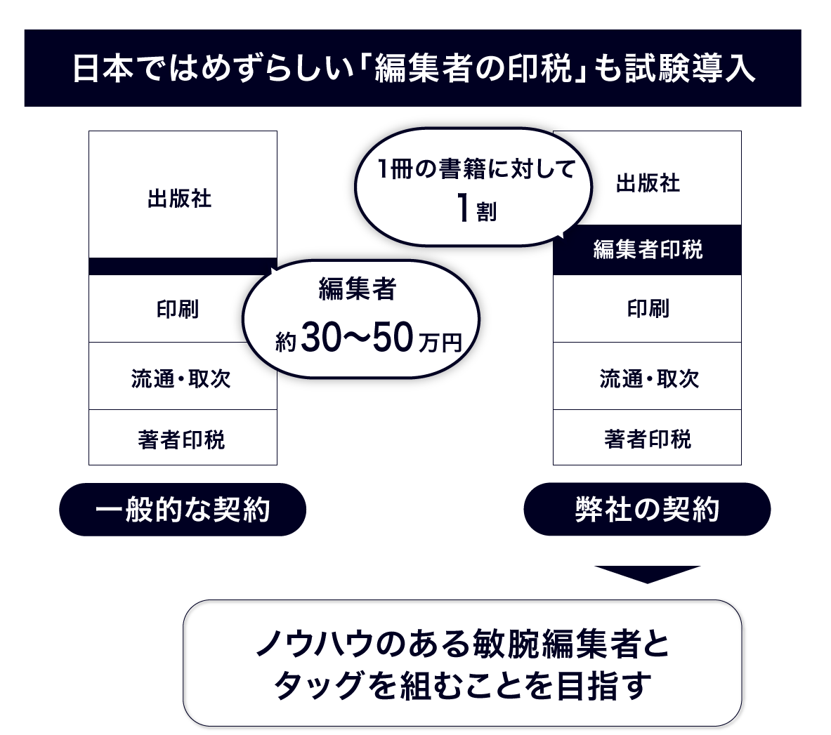 また、多くのヒット作を手がけ、ノウハウのある敏腕編集者ともタッグを組みたいと考えています。そのため、日本ではめずらしい「編集者の印税契約」も取り入れる予定です。通常、書籍編集はフリーの編集者が1冊あたり約30~50万円で請け負いますが(弊社調べによる)、弊社では企画の内容、編集者のスキルと作業量によって、画期的な「編集者との印税契約」も行う計画です。