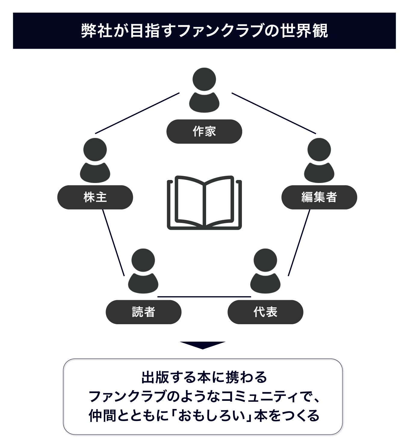 少額投資家を中心としたコミュニティをつくり、「本が好き」「読書が好き」「弊社のファン」、そんな方々の声を聞きながら本づくりを行うことで、少しでも確度の高い「おもしろい」本の出版を目指します。