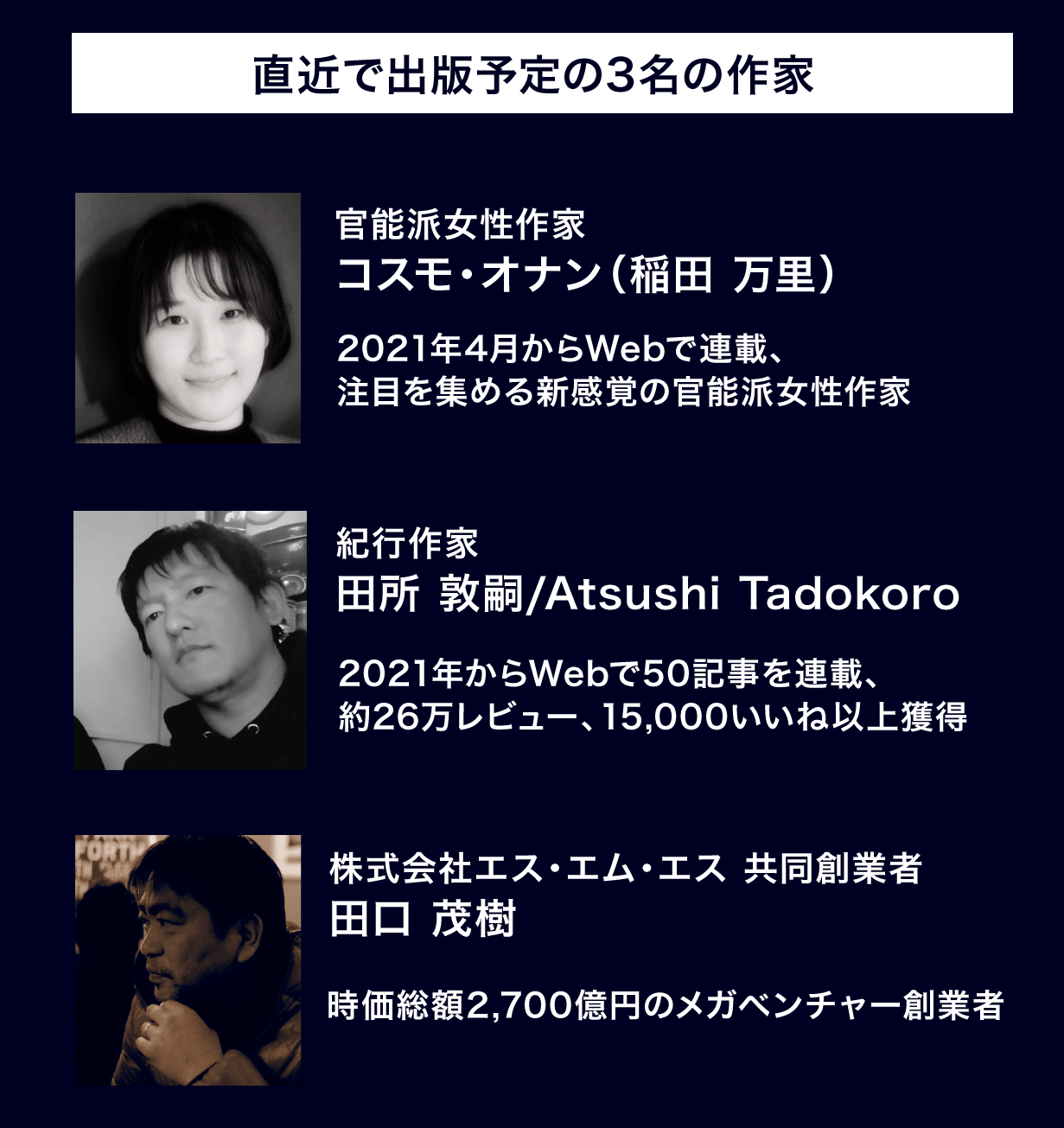 直近では8月、10月、12月に、SNSで注目を集める新感覚の官能派女性作家、Webで多くのPV数を集める紀行作家、メガベンチャーの創業者という新人作家3名の書籍を出版する予定です。年間12点程度の書籍が出版できる事業規模を弊社は目指し、維持していきたいと考えています。