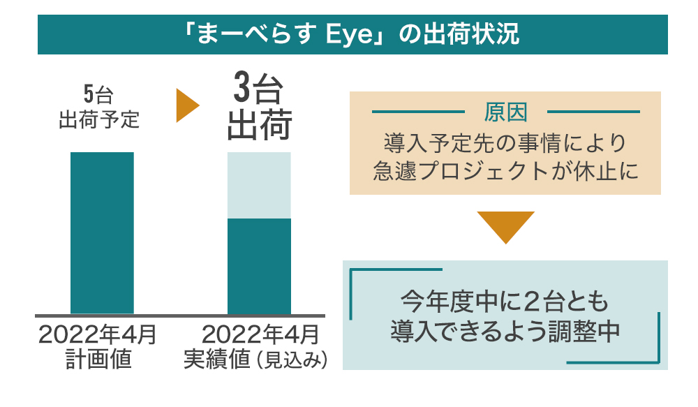 「まーべらす Eye」の前年度KPI(重要業績評価指標)は、5台の出荷目標でしたが、結果として3台の出荷に留まりました。出荷できなかった2台については、導入予定先であった企業の諸事情による導入の延期が原因となります。
