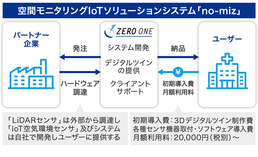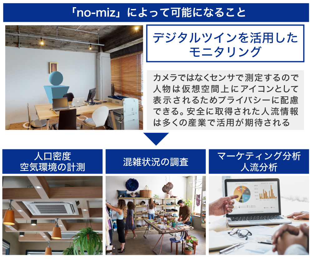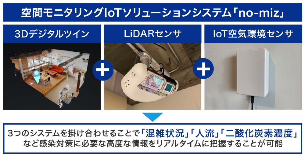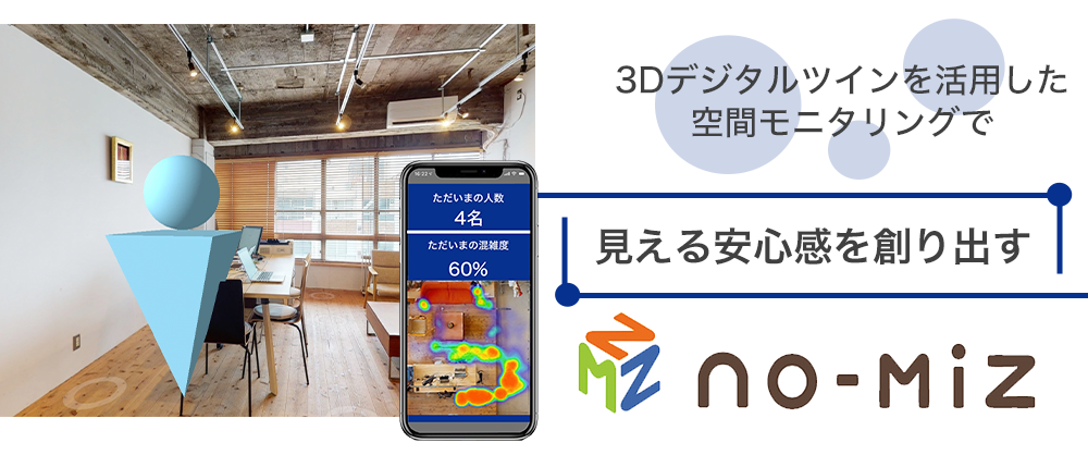 ãno-mizãã¯ã3Dããžã¿ã«ãã€ã³ãå¶äœããéšå±ïŒå®éã®ç©ºéïŒã«ã人ã®äœçœ®ã人æµãæç¥ãããLiDARïŒã©ã€ããŒïŒã»ã³ãµããšãéšå±ã®ç©ºæ°ãèšæž¬ãããIoT空æ°ç°å¢ã»ã³ãµããåãä»ããããšã§ã3Dããžã¿ã«ãã€ã³äžã«ãªã¢ã«ã¿ã€ã ã®äººæµïŒæ··éç¶æ³ïŒãšç©ºæ°ç°å¢ã衚瀺ããããšãå¯èœã«ããŸããã