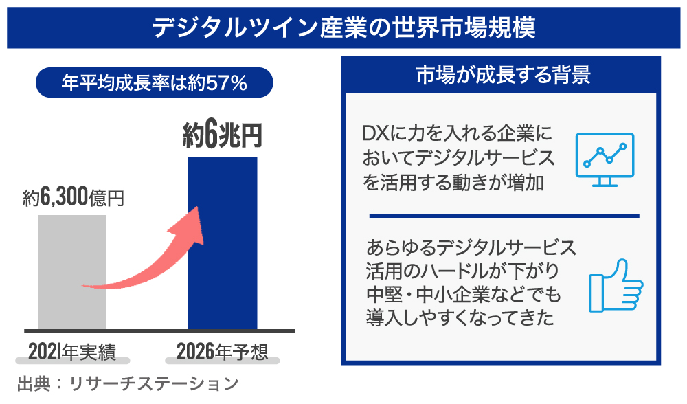 åŒç€Ÿãäºæ¥ãè¡ãã3Dããžã¿ã«ãã€ã³ã掻çšããç£æ¥ã®äžçåžå ŽèŠæš¡ã¯2021幎ã§çŽ49åãã«ïŒçŽ6,300ååïŒã2026幎ã«ã¯çŽ502åãã«ïŒçŽ6å åïŒãšãåžå Žã®å¹Žå¹³åæé·çã¯çŽ57.0%ã«éãããšäºæž¬ãããŠããŸãïŒåºå žïŒãªãµãŒãã¹ããŒã·ã§ã³ïŒã