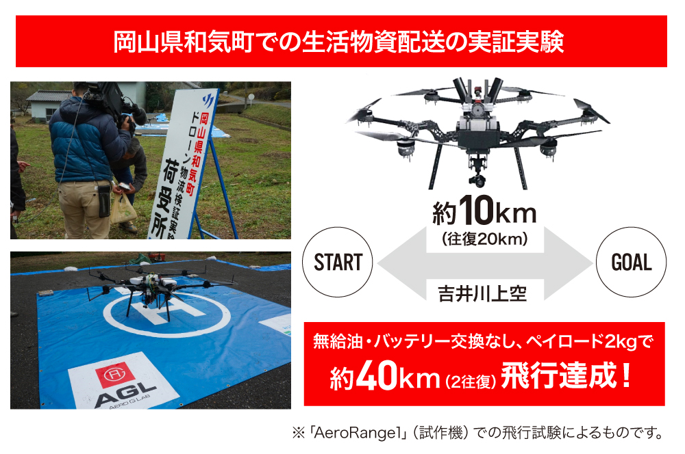 2018年に国土交通省が行った岡山県山間部に生活物資を届ける実証実験では、弊社のドローンが2往復約40kmの距離を約2時間連続で飛行できました。バッテリー型であれば複数回バッテリー交換が必要になる距離です。これだけ実用化に近い製品は他にほとんどないと考えています。