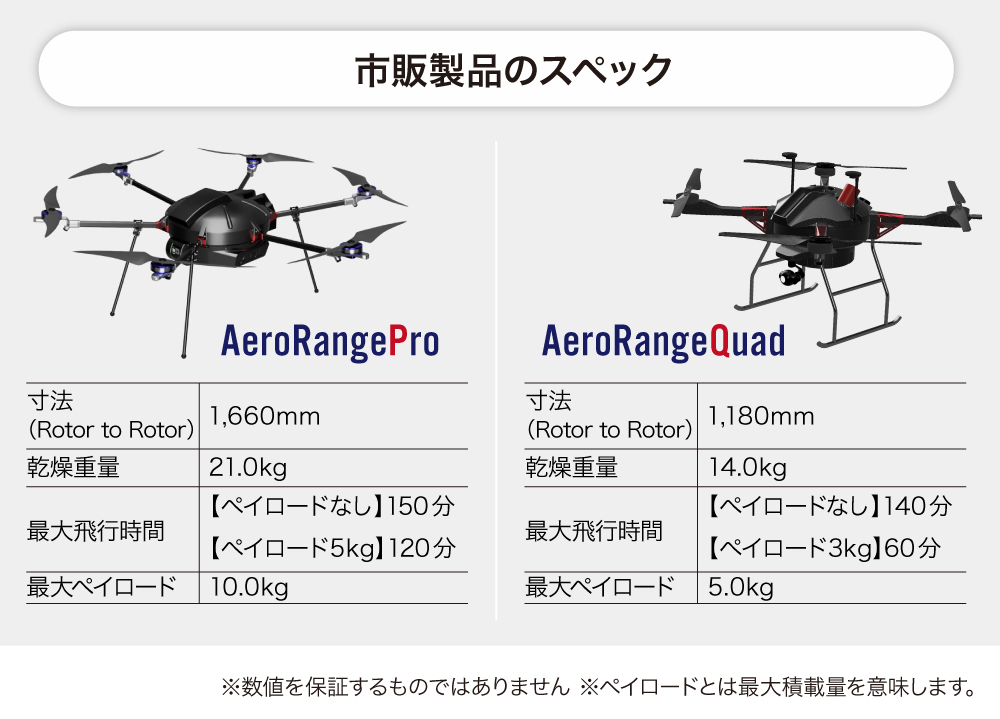2018年に開発した試作機「AeroRange1」は、数々の実証実験で優秀な成績を残しました。この実績をもとに、フラッグシップモデルとして2020年に「AeroRangePro(プロ)」の発売をスタートし、様々な企業で稼働しています。また、量産型モデルの「AeroRangeQuad(クアッド)」も今年より販売をスタートし、すでに納品・稼働がスタートしています。