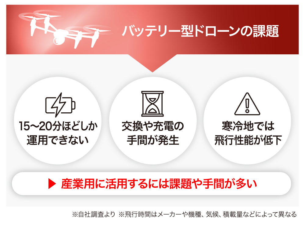 そして、飛行可能な時間を超えて運用を続けるには、一度着陸させてバッテリーを入れ替える必要があります。産業用として丸一日利用しようとするならば、1個あたり数kgはあるバッテリーを何十個も用意しなくてはなりません。充電にも時間がかかりますし、人為的なミスによる作業遅延リスクもあります。