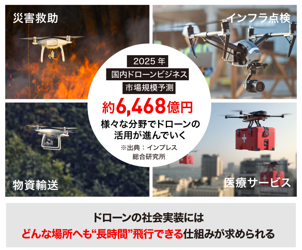 飛行時間はドローンの有用性や活用の幅に大きく影響する要素です。しかし、長距離の物流や大規模施設の調査・点検、災害現場や被災地のように頻繁な充電が不可能な環境下での人命救助等、20分程度では完了しきれない作業も多々存在します。その様な中、弊社製品を活用し、長時間飛行やバッテリー交換が不要になることで、様々な領域においてドローンを活用していただけると考えています。