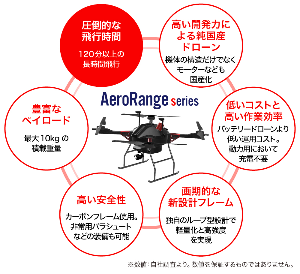 弊社は、バッテリーではなくエンジン発電機を動力源とするハイブリッド型ドローン「AeroRange(エアロレンジ)シリーズ」を開発・販売しています。現在の主流のバッテリー型ドローンの実質運用可能時間が概ね15~20分であるところ、弊社のハイブリッド型ドローンは2時間以上の飛行が可能です(弊社調べより)。