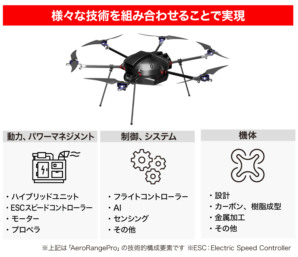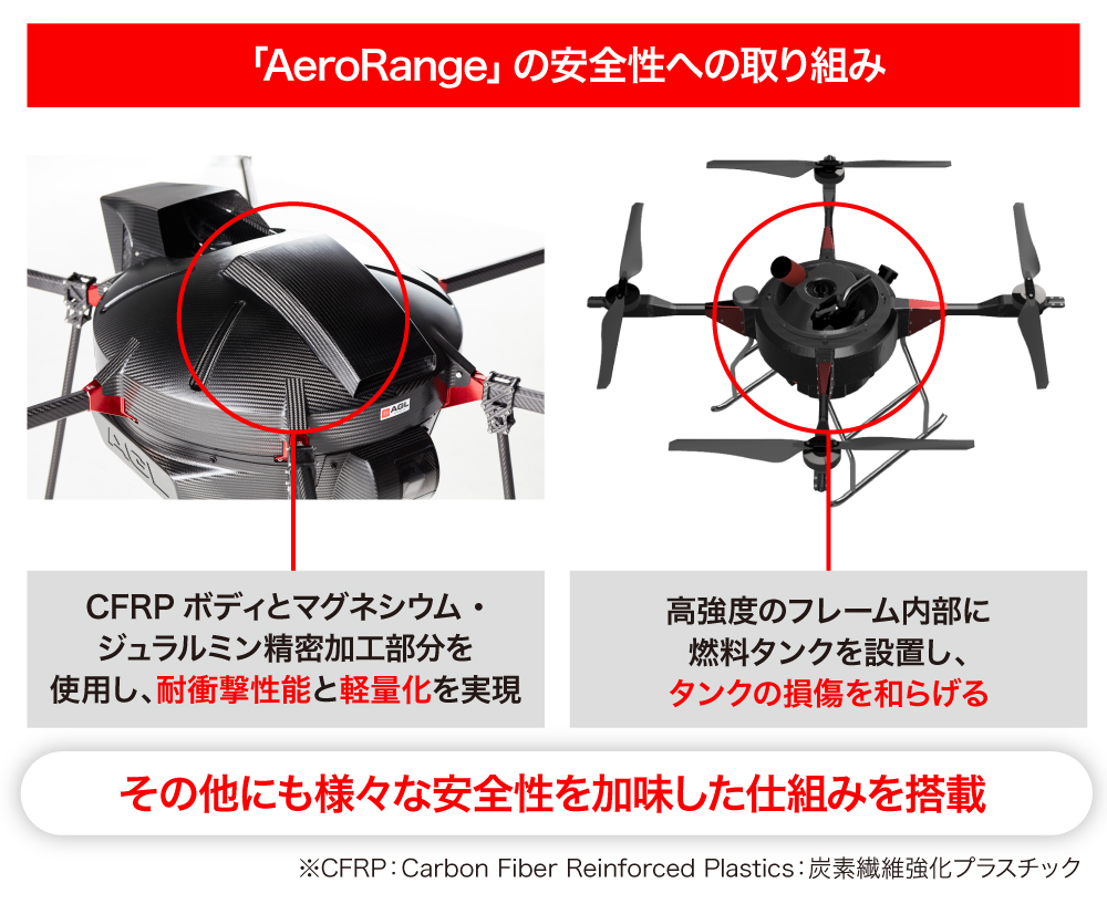 「AeroRangePro」では、燃料タンクをメインフレームの内側に配置し、たとえ墜落して機体が損傷したとしてもタンクが損傷しにくい構造にしています。「AeroRangeQuad」では、高強度のフレーム内部の空洞を燃料タンクにしています。これらの配置や貯留方法は特許を取得済みです。