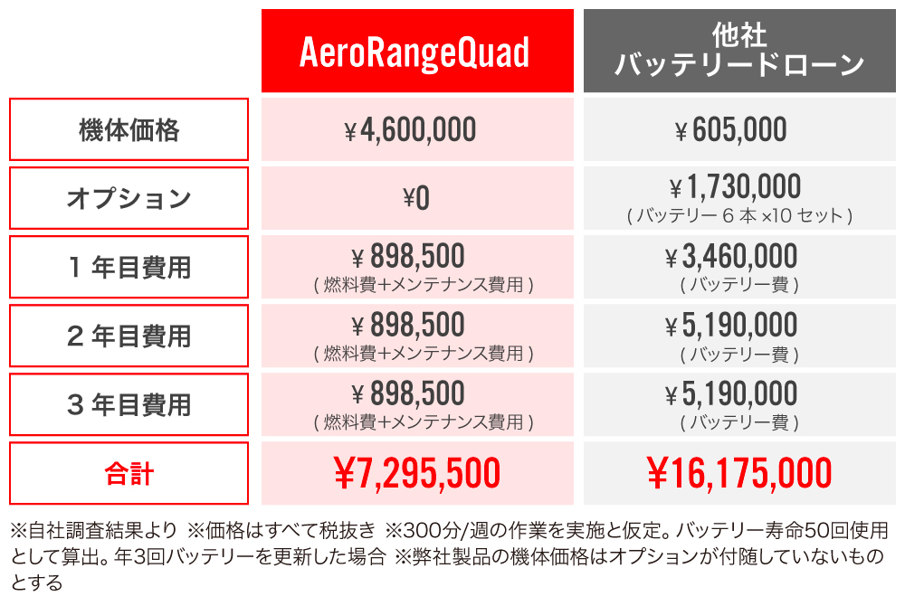 弊社では、1年目ですでに、累計の金額においてハイブリッド型ドローンの方がコストを抑えられるという試算をしています。使用期間が長く、使用頻度が高くなるほどハイブリッド型ドローンへの切り替えをおすすめできます。