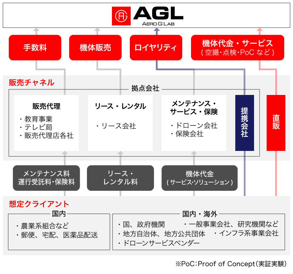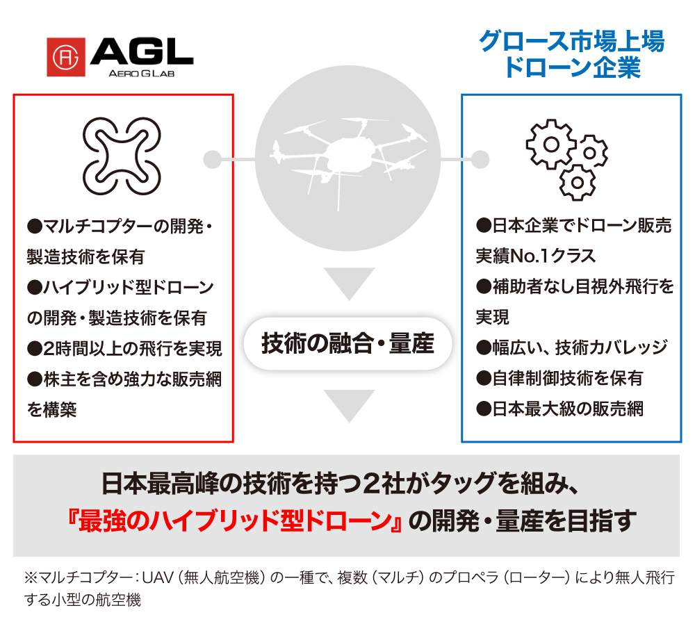 2020年12月には、日本企業でドローン販売実績No.1の販売網を持つ上場企業(以下、同社)と、ドローン機体の開発・製造委託契約を締結しました。これにより、弊社のハイブリッド技術を用いたドローン開発のノウハウを同社に提供し、同社の自動制御技術と組み合わせた上でNo.1の実績を持つ販売網で販売することができると考えています(詳しくはこちら)。