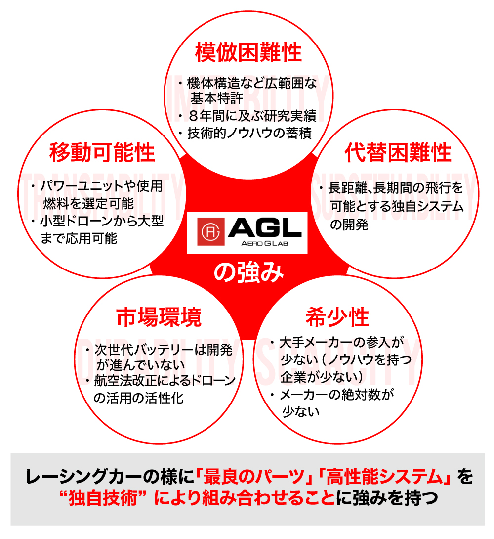 弊社は、長年ドローンの研究開発に携わってきた技術的ノウハウを強みとしています。機体の設計から行っているので、パワーユニットや燃料の選択や機体の仕様変更等、顧客からの要望によるカスタマイズにも容易に対応可能です。また、製造した機体をそのまま販売するだけではなく、顧客に合わせた開発・カスタマイズ案件でも収益を見込んでいます。