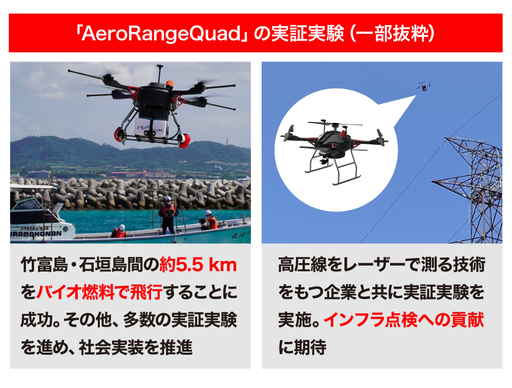そして、昨年3月のバイオ関連の上場企業との共同実験では、量産型の「AeroRangeQuad」を使用し、竹富島・石垣島間の約5.5 kmをバイオ燃料で飛行することに成功しました。その他の取り組みはこちらからご確認いただけます。