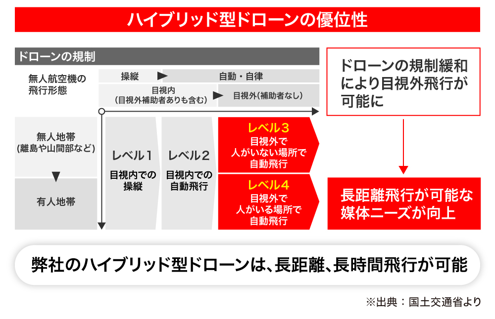 現在、日本を含め世界中で使用されているドローンをハイブリッド型ドローンに切り替えることで、現場の効率向上や人為的ミスの減少につながると弊社は考えています。