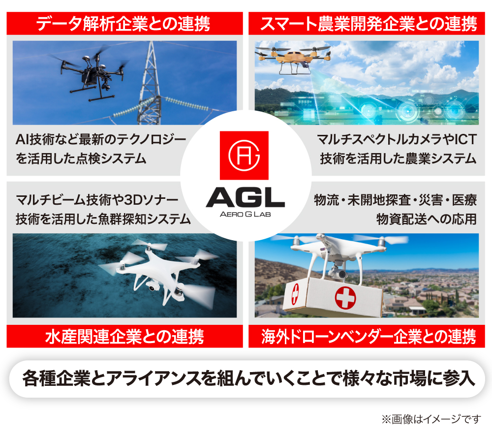 弊社はアライアンス戦略により様々な企業と手を組み、幅広いマーケットへのビジネス展開を見込んでいます。インフラ点検や測量、畑への農薬散布には既にバッテリー型ドローンが導入されていますが、飛行時間の差からハイブリッド型ドローンへの切り替え需要を見込んでいます。既に大手インフラ企業や農業開発企業と一部話が進んでいます。AIや画像解析の技術を持つ企業とアライアンスを組むことで、既存の利用場面でも新たな活用方法を提案することも可能です。