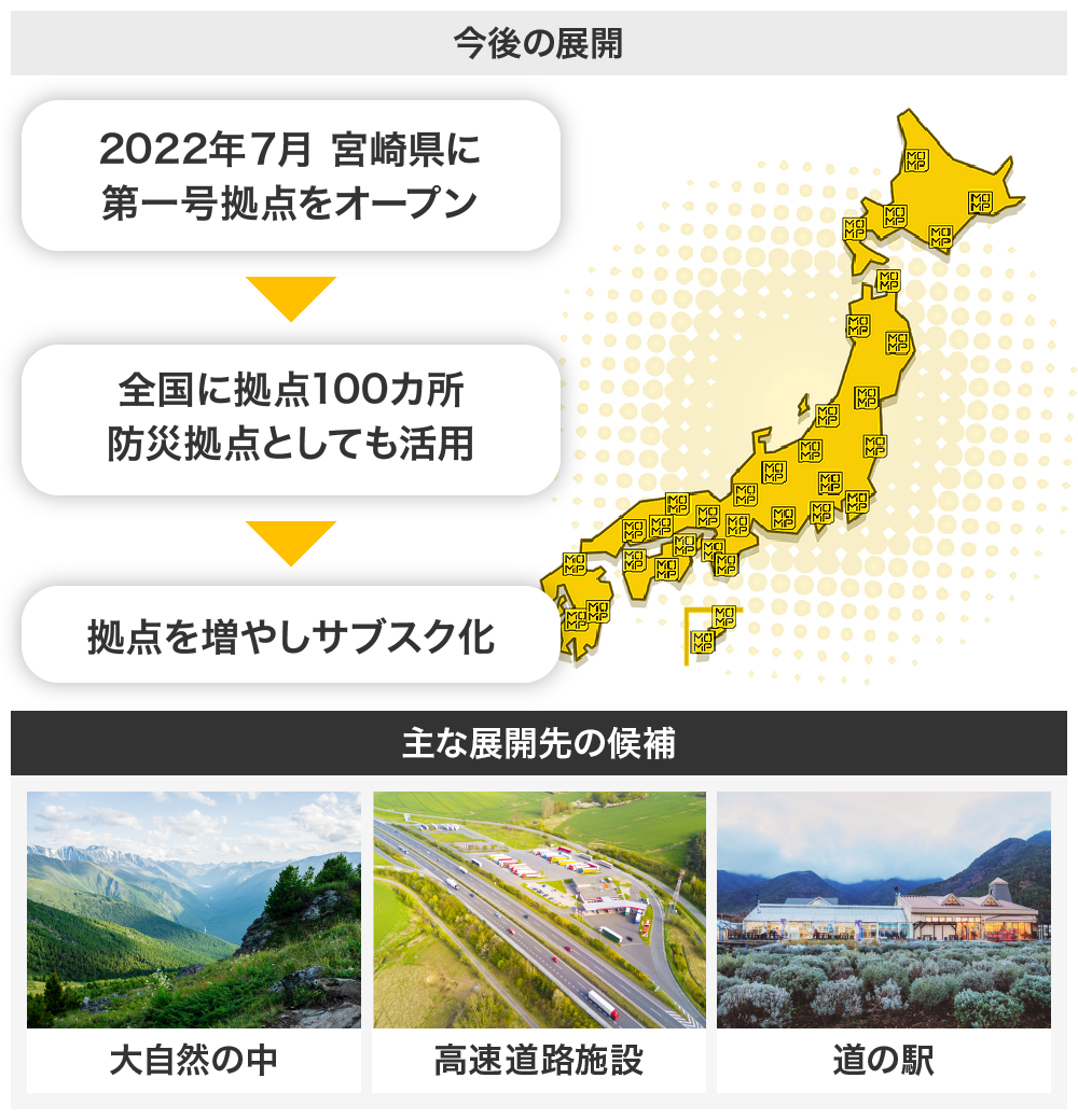 この第1号拠点の展開を皮切りに、大手インフラ企業から紹介いただいた候補地約20カ所への展開を加速させる計画です。